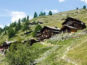 Findeln is a group of hamlets above Zermatt in the canton of Valais. They are located on the south facing slopes of the SunneggaUnterrothornOberrothorn mountains. The main hamlets are Eggen (2,177 m) and Ze Gassen (2,051 m), where there is a chapel. Both are easily accessible by the Zermatt–Sunnegga funicular.