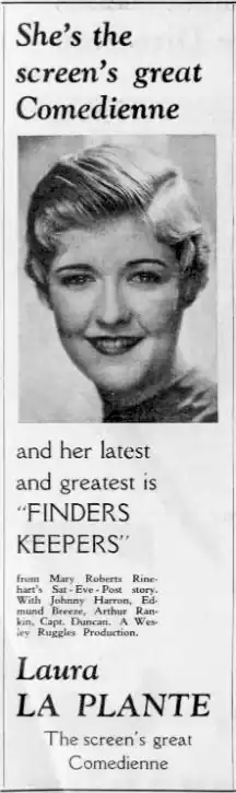 Finders Keepers is an extant 1928 American silent military comedy film directed by Wesley Ruggles and Otis B. Thayer and starring Laura La Plante and John Harron.[1][2] Due to the public apathy towards silent films, a sound version was prepared late in 1928. While the sound version has no audible dialog, it features a synchronized musical score with sound effects using both the sound-on-disc and sound-on-film process. It was produced and distributed by Universal Pictures. The film may or may not be a remake of a 1921 film Finders Keepers singularly directed by Thayer.