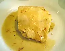 Finnan haddie (also known as Finnan haddock, Finnan, Finny haddock, Finny haddie or Findrum speldings) is cold-smoked haddock, representative of a regional method of smoking with green wood and peat in north-east Scotland.[1]