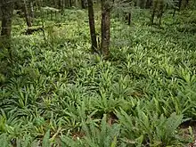 Fiordland National Park contains the majority of the largest area of unmodified vegetation in New Zealand. The dense forests, often clinging to steep valley sides, comprise mostly silver beech and mountain beech, but also podocarps. A large variety of shrubs and ferns, often dominated by crown fern, make up a rich understory of plants, with the forest floor covered in mosses and liverworts.[10] The abundant vegetation is supported by the high rainfall, but continues to be damaged by introduced species such as red deer and possum.[11][12][13]
