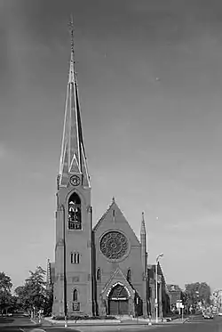 The church is a tall single-story brick structure, with sandstone trim and decorative detailing in terra cotta, and has Gothic Revival styling. It has a gabled slate roof with a clerestory section near the top of the gable, with the rear section having a cross-gable roof. The slate is mainly gray-green, with bands of red. A tower rises at the northeast corner of the building, rising to an open belfry with lancet-arch windows at the third stage. Clock face sections with gabled tops interrupt the steeple, which is eight-sided, finished in slate.[4]