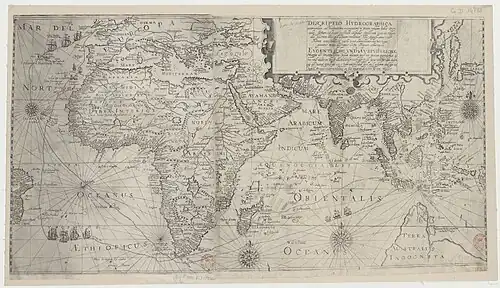 However, in 1592 the cartographer Petrus Plancius published a series of charts showing, in exact detail, the route to the Indies.[2] Soon after these charts were published, three Amsterdam merchants began meeting in secret, plotting an expedition to Indonesia. Their names were Jan Jansz Carel, Hendrick Hudde, and Reynier Pauw.[3] One of the first things these men did was to send Pauw's cousin, Cornelis de Houtman, to Lisbon, posing as a merchant. His job was to confirm Plancius' charts and see if he could find any more information on the East Indies.[2] Then, in September 1592, Jan Huyghen van Linschoten returned from an extended stay in Goa, India, and soon after, in collaboration with noted traveler Bernardus Paludanus, he published an account of his journeys that included a large amount of information on the East Indies that confirmed all of Plancius' charts and added more besides.[4] In early 1594, de Houtman returned from Lisbon.[5]
