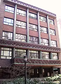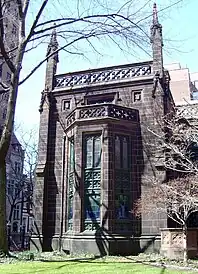 The church complex, which is surrounded by a fence, partly of wood and partly of cast-iron,[4] also includes a stone Gothic Revival parish house or "South Wing" at 7 West 11th Street,[16] which includes the Alexander Chapel added in 1937, with stained glass windows on Scottish themes.[4] The interiors of the rooms in the South Wing were significantly renovated and remodeled in the 1990s,[4] and many of the rooms are available for rental.[17] On the north side of the complex is the Church House at 12 West 12th Street, the Mellin Macnab Building,[17] built in 1958–60, and designed by Edgar Tafel,[3] who apprenticed under Frank Lloyd Wright. Tafel's design combined Prairie School influences with the Gothic style of the sanctuary,[7] and has been called "a fine example of contemporary design ... used intelligently, to bring a much needed contemporary building into harmony with a neighborhood."[18] Tafel's design won an award from the Fifth Avenue Association.[4]