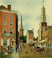 First Presbyterian's original pastor was James Anderson, who had been preaching in New York to the small-but-growing Scots population, whose influence increased with the appointment of a number of Scotsmen to be Governors of the New York colony.[8] During the American Revolution, the church became known as the "Church of Patriots" due to many from its congregation being involved in the effort against Great Britain. Their dissatisfaction partly arose partly because the King had consistently refused to issue the Church a charter in 1766 and afterwards, claiming a duty to uphold the exclusive rights of the Church of England, represented in New York by Trinity Church.[9] First Presbyterian's pastor from 1765 to 1811, John Rodgers, had to leave the city during the British occupation because of his activities.[6] Such activities had their consequences: authorities confiscated the church, along with other churches associated with the Patriot movement, as barracks for British troops, stables for their horses, warehouses and prisons.[10]