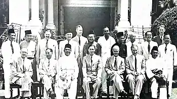 Members of the Cabinet of the Federation of Malaya, 1955: Sitting from the left: C.J. Thomas (Secretary of Finance), H. S. Lee (Minister of Transport), Tunku Abdul Rahman (Chief Minister and Minister of Home Affairs), Donald MacGillivray (High Commissioner), D.J. Watherson (Chief Secretary), J.P. Hogan (Attorney General), and Dr. Ismail Abdul Rahman (Minister of Natural Resources). Standing from the left: Bahaman Samsuddin (Deputy Minister of Home Affairs), Abdul Razak Hussein (Minister of Education), O.J. Spencer (Secretary of Economy), Abdul Aziz Ishak (Minister of Agriculture), A.H.P. Humphrey (Secretary of Defence), Suleiman Abdul Rahman (Minister of Local Government, Housing and Town Planning), V. T. Sambanthan (Minister of Labour), Sardon Jubir (Minister of Works), Leong Yew Koh (Minister of Health), Ong Yoke Lin (Minister of Communications, Telecommunications and Posts), A.S.H. Kemp (Secretary of State), and Too Joon Hing (Deputy Minister of Education).