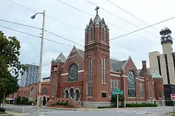 The First United Methodist Church is a historic church at 723 Center Street in Little Rock, Arkansas. It is a large brick building, designed by Frank W. Gibb and built in 1899–1900. It is one of the city's finest examples of Romanesque Revival architecture, with square towers at its corners, and its predominantly smooth brick exterior contrasted by rusticated granite trim. The congregation, founded in 1831, is the oldest Methodist congregation in the city, and the mother congregation of many of its other Methodist establishments.[2] Its senior pastor is the Rev. David Freeman.