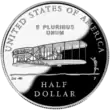 The First In Flight half dollar was struck in the standard half dollar composition of nickel-clad copper. The obverse of the coin features the Wright Brothers Monument, while the reverse features an image of the Wright Flyer making its historic flight. 750,000 half dollars were authorized, of which 109,710 proof and 57,122 uncirculated coins were minted at the Philadelphia Mint.[2]
