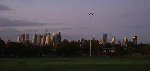The skyline of Melbourne from Brunswick Street Oval, Fitzroy.