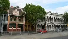 As early as 1923, the City of Fitzroy was accused of 'creating slums' by allowing inappropriate development such as three houses on a 31-foot by 100-foot block.[27] By 1953, the state Housing Minister Thomas Hayes, said that Camp Pell in Royal Park, Parkville, Victoria, which had been a temporary military camp for United States forces during the Second World War, 'might become a permanent emergency housing settlement' and 'Fitzroy slum dwellers who had refused offers of alternative accommodation by the housing Commission because they would have to pay higher rents would probably' be moved there.[28] Two years later the headline was 'Outcry Rages Over Fitzroy Slums', as the state government accused the Commonwealth of bringing in immigrants that the states had nowhere to house, arguing that the 'Awful, dilapidated buildings in Fitzroy, crowded beyond description with exploited New Australians were a grave danger to the health of the community.'[29] The Atherton Gardens high-rise public housing estate, on the corner of Brunswick and Gertrude Streets, is one of Melbourne's largest, built by the Housing Commission of Victoria as part of its controversial "slum clearance" urban renewal program in the 1960s. The commission was established by the Housing Act 1937 in response to slum housing in Melbourne, and operated under the Slum Reclamation and Housing Act 1938.[30]