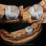 An onlay is a method of tooth restoration, that covers, protects, or reinforces one or more cusps. Onlays are methods for restoring teeth in an indirect way. Onlays are often used when teeth present extensive destruction due to caries or to trauma.