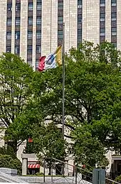 The chrome yellow, white, and scarlet red triband (officially a 1:2:1 proportion, but is often made a 1:2.3:1 proportion to fit the seal) is a reference to Spain, who funded Christopher Columbus' expeditions to the Americas. Columbus, the namesake of the city, is also referenced near the center of the seal, where a ship of his fleet is depicted. The ship is completely enclosed in a circular yellow border. Surrounding this is a shield modeled on the design of the Flag of the United States, with 13 red and white stripes and 12 white stars (6 on either side of the ship design) on a dark blue background.[1] The city flag's dimensions of 10:19 are also related to the United States flag. Instead of directly stating the proportions, the municipal code of Columbus mandates that the flag be of the same proportions of the United States flag,[2] which was specified to be 20 by 38 (often simplified to 10 by 19) in a 1959 executive order following the admission of Hawaii to the Union.[3] Perched on top of the shield is an eagle with outstretched wings, yet another example of American symbolism. Behind the eagle is the dome of the Ohio State Capitol building, denoting Columbus' importance as Ohio's capital city. Just above the dome is the text "Columbus, Ohio" in yellow old English font. Encircling all the seal's elements mentioned above are 16 yellow five-pointed stars and a half-wreath of buckeye leaves. The eagle is grasping onto a single yellow star, which, with the additional 16 stars, represents Ohio as the seventeenth state to join the Union. The buckeye leaves are another representation of Ohio, as it is the state tree.[4][5] The seal, adopted in 1912, originally did not contain the blue field. On December 9, 1958, the entire emblem was adopted as the city's seal. Originally, it was only regarded as the coat of arms. The official description of the seal allows for some artistic interpretation, and thus different versions of it have been designed.[1]