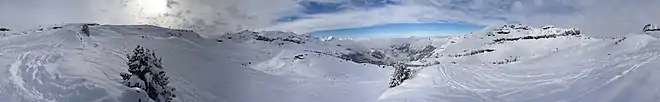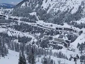 Flaine is a ski area in the Haute Savoie region of the French Alps, and is a part of the linked Grand Massif domain. It is in the territory of the communes of Magland and Arâches-la-Frasse. Flaine is linked to Samoëns, Morillon, Les Carroz and Sixt-Fer-à-Cheval, with 267 km of pistes in total. It featured the first 8-seater high speed chairlift, Les Grands Vans, and the first snow cannons to be installed in Europe.[1] Flaine is often called the "big snowy bowl" due to it having one of the best snow records in the Alps.[2] It is a modern, car-free resort with a wealth of amenities, all in close proximity to the accommodation.[3]