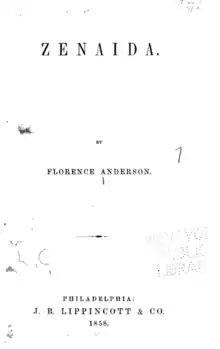 Her first writings were prose; and her first book, Zenaida, a Romance (Lippincott & Co., Philadelphia, 1859) was published when she was a resident of Paris, Kentucky. In Zenaida, the frequent, familiar allusions to classic subjects, and the use of words of classic derivation in preference to the more rugged and vigorous Saxon, were noted as defects in her style by more than one critic. The book was written as a contribution to a small paper, edited by a sister and herself to enliven the winter evenings, in a quiet country home. Read aloud by that sister's voice, the imperfections of Zenaida were overlooked by the sisters, and the book was published before Anderson had had time to edit it. Its flattering reception by an indulgent public would, doubtless, have stimulated the Anderson to continue writing in the field of romance, had not the Civil War absorbed her sympathies, and paled the desire to write.[3]