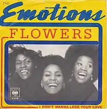 "Flowers" is a song recorded by R&B group the Emotions, and the title track to their 1976 album. It was released as a single in May 1976 by Columbia Records.[1] The single reached No. 16 on the US Billboard Hot Soul Singles chart and No. 2 on the NZ Top 40 Singles chart.[2][3][4]