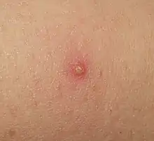 Folliculitis is the infection and inflammation of one or more hair follicles. The condition may occur anywhere on hair-covered skin. The rash may appear as pimples that come to white tips on the face, chest, back, arms, legs, buttocks, or head.[1]