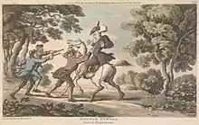 Doctor Syntax – a popular literary character of the early nineteenth century – on horseback, stopped by three robbers armed with pistols