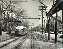 The corridor began life in the 19th century as a heavy rail line used by the Rock Island and Wabash railroads along with local streetcars.[4] The segment between the Terminal Railroad's Central Belt Subdivision (near present day Interstate 170) and Forsyth Junction (now the junction of MetroLink's Red and Blue lines) was abandoned by the Rock Island in 1931. Prior to its abandonment, the railroad operated a passenger depot at Clayton, near the spot of today's MetroLink station. In the 1940s, before the suspension of streetcar service in the St. Louis area, the portion of this corridor between Pershing and DeBaliviere avenues carried the #1 Kirkwood and the #14 University-Clayton streetcar lines. Service on the Kirkwood line ended in 1950 with service on the University-Clayton line ending in 1963.[5][6] The Wabash Railroad continued to operate freight service east and north of Forsyth Junction until 1988.