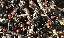 In the Blue Mountains of Oregon, F. obscuripes has demonstrated the capacity for polydomy. A supercolony in a four-hectare (9.9 acre) study area near Lehman Hot Springs consisted of 210 active nests with an estimated population in excess of 56 million ants.[6]