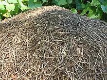 F. obscuripes creates distinct, dome-shaped mounds composed of varying materials found in the nest's surrounding environment. This composition is primarily vegetation and is commonly called "thatch". The mounds are typically constructed in areas devoid of cover to expose the nest to sunlight. The size of these mounds is highly variable and is mostly determined by the age and health of the colony. The height ranges from 1 to 18 inches (15–45 cm), although nests of larger heights are not uncommon, and can extend down to 4 ft (1.2 m) in the ground, with chambers present in both the thatched mound and the soil. The condition of the thatched mound is in a constant state of change due to activities by the ants and changes in the environment.[3] To prevent plants from shading the nest, the ants may chew off the bark at the base of plants growing on or nearby the mound. Formic acid is then sprayed into the open layer eventually killing and felling the plants.[4]