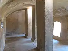 Fort Dansborg is located in the southern part of Tharangambadi, located 283 km (176 mi) from the state capital Chennai. It is built in Danish style, characterized by large halls, columned structures, high ceilings and projecting drapery.[18] The length of the fort in the side facing the sea is 60 m (200 ft) and the width is about 11 m (36 ft). The fort is trapezoidal in shape with three rooms in the left wing, originally used as the governor's residence, a kitchen with an open fireplace and chimney in the top left hand corner, and a church room, now a museum, located in the centre of the building. The original rectory and the northern part of it, which are now the store rooms, are located in the right wing. The corner room on the right side was the residence of the commercial director. In modern times, it is used as a store room. The core of the building is made of brick. The main door of the fort faces north, while an additional door faces the east.[21][22][23][24] The second storey of the fort has a set of guard rooms.[25] The staircase leading to it are built with bricks.[26] The central part of the fort has four camel hump shaped domes. The central pillar of the hall holds the entire weight of the domes.[23]