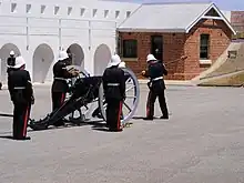 For the eighteen months after its opening, the fort was manned by B company of the South Australian Volunteer Artillery but only on weekends.[25] This changed in mid-1882 when South Australia's first permanent military force was formed.[26] The fort became the headquarters for the South Australian Permanent Military Force, then the state's entire standing army of one officer and eighteen other ranks.[27] Some of the unit was stationed at nearby Fort Largs from 1886; and, by 1889 the unit had grown to one officer and 45 other ranks.[12] This force grew to 53 of all ranks by 1892 and was by then known as the Permanent Artillery. The unit trained 27 more non-commissioned officers and men who were sent to man the King George Sound batteries near Albany, Western Australia. Though some of the gunners served in the Second Boer War, the unit itself never saw action. Fort Glanville's section was called out in 1890, marching to assist the police with a waterside worker's strike in Port Adelaide. In this case no shots were fired and the strikers did not confront the police or troops.[27] Additional defence acts were passed in 1886, 1890 and 1895 but, until defence passed into federal hands after 1901, the state's permanent military force was composed solely of artillery.[12] Shortly after the federation of Australia, a regiment of the Royal Australian Artillery (RAA) was formed and what had been the Permanent Artillery became No.10 company RAA.[27] The fort was manned to an extent during World War I, with one non-commissioned officer and 11 gunners stationed as of November 1914. Military reports and orders show the fort manned to at least mid-1918, though at this point it is doubtful if the guns were fit to engage targets.[28]