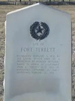 Originally named "Post on the Rio Llano", "Post on the North Fork River Llano", or "Camp Lugubre", it was renamed in 1852 after Lt John Terrett.[2] Terrett was killed in the Battle of Monterrey in 1846. Lt. Col. Henry Bainbridge established the camp in February 1852 for protection for the settlements and travelers along the Upper San Antonio Road. It was located along the North Llano River in Sutton County.[3] The post was abandoned in February 1854 the troops locating farther to the west and north on the advancing frontier. The fort buildings were then used for the Terrett Ranch. The state of Texas constructed a site marker, now located off CR 307 near I-10, Exit 429.[4]