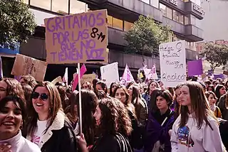 Another important law passed during this movement included the 2007 Law for effective equality of women and men.[29] Some Spanish fourth-wavers began to reject Gay Pride events, believing they were just one more commodification of women's bodies, being used to market events for broader capitalist consumption while also serving to entrench patriarchy.[40]