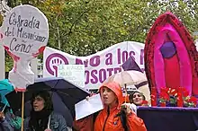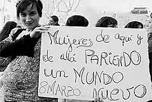 One of the most unifying elements of Spanish fourth-wave feminism is sexual violence.[24] Sara Berbel says that patriarchy condones sexual violence against women, as a way of forcing women to go back to the home.[24] Gender violence, macho violence and sexist violence are all used interchangeably among Spanish feminist to mean violence committed by men against their female partners, be they girlfriends, ex-girlfriends, wives or ex-wives.[25] Fourth-wave feminists define machismo in a number of different ways. Feminist Alde! member Anabel Sanz defines it as, "feminism, rather than the opposite of machismo, is what opposes machismo."[26] Journalist Irantzu Varela defines machismo as, "It is like saying 'neither freedom nor slavery', that is, putting in parallel a way of thinking and a struggle that claims that all people have the same rights and that they fight against all forms of oppression and discrimination, with an ideology that considers that men, just because they are, are superior and have the right to have privileges. "[26]