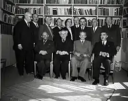 Ministers of the Fourth Government with the President on 24 December 1952. Sitting from left to right: Ben-Zion Dinor, David Ben-Gurion, President Yitzhak Ben-Zvi, Dov Yosef. Standing from left to right: Peretz Naftali, Levi Eshkol, Pinchas Lavon, Yosef Serlin, Golda Meir, Pinhas Rosen, Moshe Sharett, Israel Rokach and Peretz Bernstein.