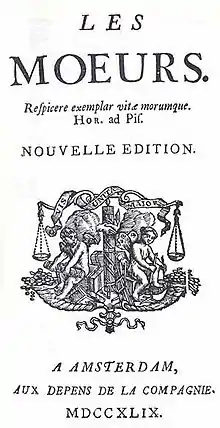 He was fortunate when his novel Les Mœurs was issued, because he was acquainted with the minister of the Navy, Maurepas. The book was a scandal (and a huge success, reprinted 13 times in the first year) for several reasons, including the fact that one of the treatise's characters was assumed to be based on the oversanctimonious queen Marie Leszczynska. Parisian reader Edmond Jean François Barbier wrote in his diary that Les Mœurs had been banned and he would now have to pay double the normal price for the book.[3]