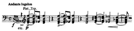 The music is scored for 3 flutes (third doubling piccolo), 2 oboes, English horn, 2 clarinets in A, 2 bassoons, 4 horns, 2 cornets in A, 2 trumpets in E, 3 trombones, tuba, timpani, bass drum, cymbals, tam tam, harp and strings.[15]