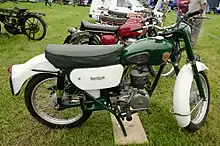 Francis Barnett was amalgamated with Associated Motor Cycles in 1947. About that time Francis Barnett brought back the Cruiser names with a 171cc AMC engined Light Cruiser.[5] The motorcycles Plover, Falcon and Cruiser were successful right into the 1950s as good light machines in Arden Green rather than the black finish of earlier days. James vehicles were in maroon. AMC considered Wolverhampton based Villiers to be dictatorial and they commissioned Italian designer Vincenzo Piatti to design a new engine to replace the Villier' engine. The Villiers engine was discontinued in new models in favour of AMC's Piatti designed unit. Unfortunately this did not work well due to cost and unreliability of the AMC manufactured engine.[18] AMC reverted Francis Barnett bikes back to a Villiers engine again.[19] The Falcon 87 with a 199cc single cylinder two stroke AMC engine was introduced and remained in production until 1966. Also that year the Cruiser 84 with a fully enclosed rear wheel and leg shields as standard equipment was available. The first Cruiser was made in 1932 and is a quiet machine made for riders where special wet proof clothing was not required. The engine being enclosed with good leg-shield and mudguard protection. The Cruiser is displayed at Lord Montague's National Motor Museum, Beaulieu.[20][21]