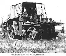- ↑ Big Lizzie had a Blackstone single-cylinder engine that delivered 60 horsepower at 275 rpm, running on a mix of diesel and crude oil. It was cooled by water, and had an exhaust-induced airflow "radiator" that Bottril had designed. The 7 feet (2.1 m) diameter flywheel weighed three tons, and the entire engine weighed eight tons. The tractor was 34 feet (10 m) long, 11 feet (3.4 m) wide and 18 feet (5.5 m) high.[7] Big Lizzie included a blacksmithy and anvil mounted on the foredeck.[8] The total weight was 45 tons.[7]