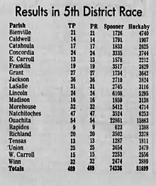 Carter's statewide victory in Louisiana (and in nine other former Confederate states) worked to Huckaby's advantage. Huckaby received 83,696 votes (52.5 percent); Spooner, 75,574 ballots (47.5 percent). Spooner surpassed Passman's primary showing by 35,000 votes, which translated only into a 0.2 percent gain over Passman's primary share of the vote because of the much larger turnout in the general election in contrast to the primary. Spooner polled 59 percent in Ouachita Parish and also won in the parishes of Lincoln (Ruston), Morehouse (Bastrop), Union (Farmerville, and Richland (Rayville), but his strength was insufficient to overcome large Democratic margins stretching from Huckaby's Bienville Parish on the west to Madison Parish (Tallulah) on the northeast, Concordia Parish (Vidalia) on the southeast, and the most northern precincts of Rapides Parish (Alexandria) on the south. Spooner received just 27 percent in Bienville Parish and less than 40 percent in Madison and Winn parishes, the latter the ancestral home of the Long political faction.[12][13]