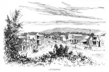 The pub to which Charlwood refers was originally named the Cannanuke Inn and was the first permanent building in the Frankston area.[5] It was built by the pre-emptive Frankston settler James Davey in the 1840s.[3][5] The Victorian Heritage Database states that it was located on the present site of the Frankston Mechanics' Institute; at 1 Plowman Place in the Frankston Central Business District (CBD).[24][25] According to Charlwood, it was purchased by a "Mr. Stone" in the early-1850s who, after the birth of his son, "Frank", renamed it "Frank Stone's Hotel" and around which the village developed and also had its name adapted from for its formal land sales in 1854.[23]