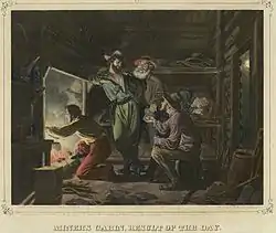Instead of mining, they sketched the miners in the foothills,[1] and Wenderoth may have taken daguerreotype photographs of miners at this time.[2] Their experience in the mining camps is captured on two stone lithographs, signed by both artists. One shows the interior of a miner's cabin at night, the second shows a miner prospecting. They are significant because they inspired two later paintings: Nahl's 1856 Saturday Night in the Mines, (painted with his brother), and A. D. O. Browere's 1853 The Lone Prospector.[5]