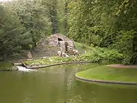 Another garden feature typical of the romantic garden is an artificial waterfall. The waterfall is 7 metres high and is partly created out of marble blocks from the building site of the Marble Church. The waterfall was left as a ruin for many years but was reconstructed in 2004.[12]