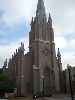 Freemason Street Baptist Church is a historic Baptist church located at Norfolk, Virginia. It was designed by architect Thomas Ustick Walter and dedicated in 1850. It is a one-story, Perpendicular Gothic style stuccoed brick church. The front facade features a projecting belfry and two stage tower topped by an octagonal spire.[3]