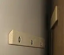 A French cleat is a way of securing a cabinet, mirror, artwork or other object to a wall.[1] It is a molding with a 45 degree slope used to hang cabinets or other objects.