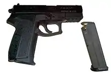SIG Sauer Pro SP 2022, French service weapon (police, gendarmerie, prison administration and customs) with PROPRIETE DE L'ETAT ("property of the State") engraved on the slide.