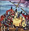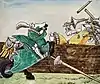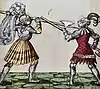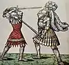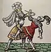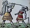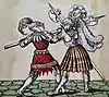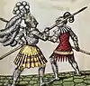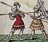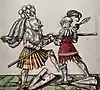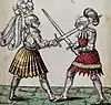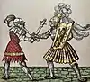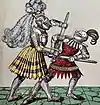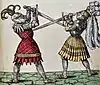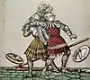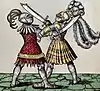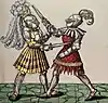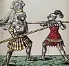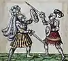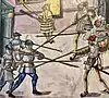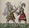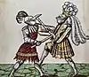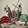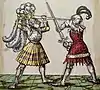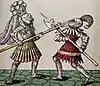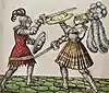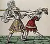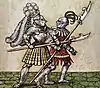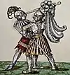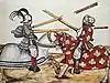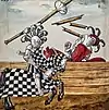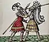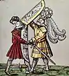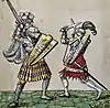 In each of the tournaments, the participants are shown engaging in a foot combat. A variety of weapons are used, including iron clubs (Eisenkolben), flails (Drischel), swords (Turnierschwert)[43] and daggers.[44] With one exception (folio 51), all the foot combat miniatures were painted by the same anonymous artist.[45]