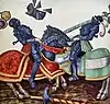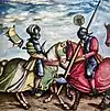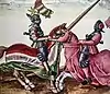 Although the draft text was never combined with the paintings to create a completed work,[18] the tournament book nevertheless mirrors it: 64 tournaments are depicted, with each tournament illustrated by two paintings of horseback jousting, a foot combat painting and a painting of mummery festivities at the end of the day.[15] The miniatures in the tournament book manuscript illustrate the types of jousting popular at the time, both on foot[note 1] and on horse.[19] Freydal features in each illustrated combat and his opponent is usually an historical figure. There is evidence that Maximilian actually jousted with some of these individuals.[19] Each picture, in the lower margin, identifies the name of the opponent and the other courtiers depicted.[25] The three most prominent opponents in the tournament book are Philipp von Rechberg and Wolfgang von Polheim, both of whom are depicted in jousts eleven times, and Anton von Yfan, Baron of Ivano, (whose actual name was Antonio de Caldonazzo[26]) who is depicted eight times.[27]