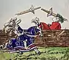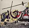 - Geschifttartschen-Rennen (Joust of war with "flying" and "exploding" shields). This combines the Bundrennen with the Geschiftscheiben-Rennen. The spectacle of the Bundrennen is increased by attaching multiple triangular platelets to the shield which, when the shield is ejected, come loose and explode into the air like a firework display.[39] Maximilian claimed to have invented this type of joust.[13]