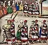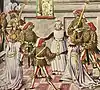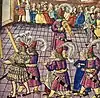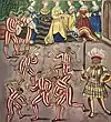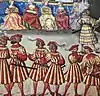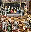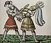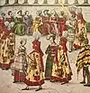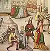 After each of the sixty-four tournaments is a scene depicting a moresca (a pantomime dance) or other post-tournament festivities with male courtiers, including the knights who had competed in the tournament, dressing up to dance in a variety of exotic costumes.[46] Known as ‘mummeries’, these were a regular feature of the evening entertainment after tournaments.[16] Although the illustrations usually depict dances — either row or circle dancing — sometimes other types of mummeries are shown, such as burlesques of little known court ceremonies, prize-givings and mock battles, for example a pike battle between peasants and Landsknechte.[47]