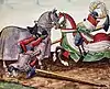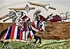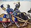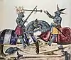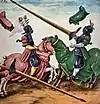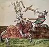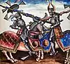 - Scharfrennen (Joust of war with "flying" shields). The shield is shown loosely fixed to the rider's breastplate, the aim being to dislodge it.[8]