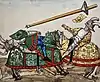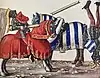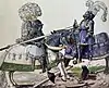- Deutsches Gestech (German joust of peace). This differed from the Welsches Gestech in that there was no barrier ("tilt") and leg armour was not worn.[31] The rider's legs had no need for leg armour as his legs were protected by a Stechkissen, a large stuffed u-shaped cushion hanging from the horse's neck.[32]