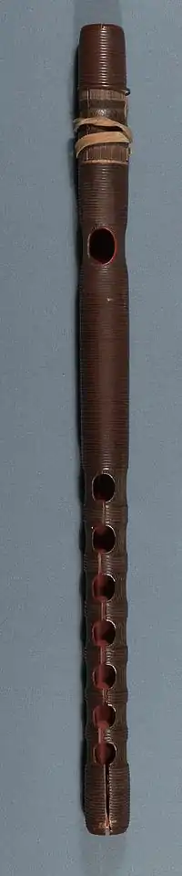 | Minteki (also known as the Seiteki) | Transverse | Used in ceremony. The sympathetically vibrating membrane, such as on a Chinese dizi, is visible in the photograph between the embouchure hole and finger holes. |