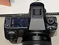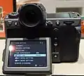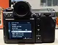 The 3.2 inch, 2.36 M pixel, three-way tilting, colour LCD, touch screen rear monitor is very similar to the GFX 100's. The 2.09 inch high-contrast monochrome top screen enables checking camera settings at a glance, even in bright sunlight, and may be customized to display display virtual dials (aperture, shutter speed, ISO), a live histogram, or other information.[10][11]