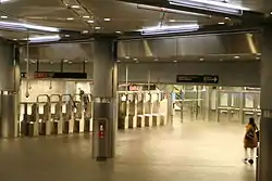 The IND mezzanine opened in various phases. Around August 2011, the William Street end of the Eastern mezzanine opened, coinciding with the opening of the 135 William Street entrance. In October 2011, due to a major realignment of the temporary transfer passageway between the Eighth Avenue Line station and the Lexington Avenue Line station, parts of the Western Mezzanine opened as well. The realignment sent passengers through the construction site of the Fulton Building.[74]: 44 By January 2012, the Western Mezzanine had opened to the northbound Nassau Street Line platforms. In June 2012, an underpass under the Lexington Avenue Line platforms, traveling approximately under Fulton Street, re-opened and was connected to the Western Mezzanine. With the opening of the new passageway, the older underpass connecting to southbound Lexington Avenue Line platform was simultaneously closed. As a result, the Western Mezzanine was substantially completed.[71]: 2 On August 2, 2012, the southbound Nassau Street Line platform was connected to the Eastern Mezzanine. An MTA press release regarded this as the substantial completion of the entire IND mezzanine.[75][76]