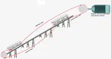 A single track starts in La Daille from where the train runs up an elevated track for 580 m (1,903 ft). The remaining 1,720 m (5,643 ft). runs through a drilled tunnel. Halfway a section of double track allows the climbing train to pass the downward train. A cable runs from the front of the lower train, via a construction of electric powered pulleys in the mountain station to the back of the descending train. The mass of the descending train helps pull the climbing train and electric motors provide the power to overcome the weight difference between the climbing and descending trains plus any friction.